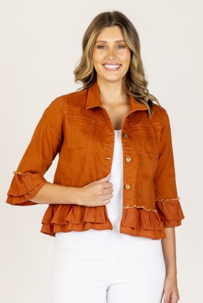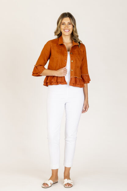 Maglia short cropped jacket with frill IN WHITE ONLYCall us (08) 8523 4161 to confirm availability, price and your size is in stock.