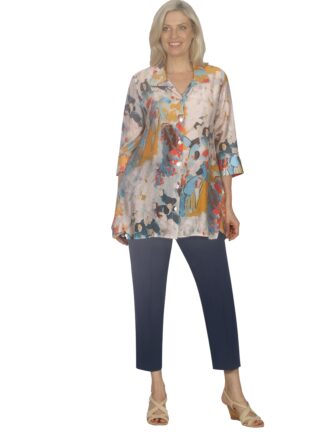 Multi coloured splice shirt with blue and orange pattern